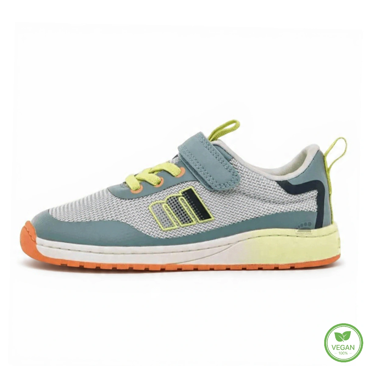 Zapatilla barefoot de color gris con detalles en verde marino, amarillo flúor y naranja de la marca Mustang, modelo Free.