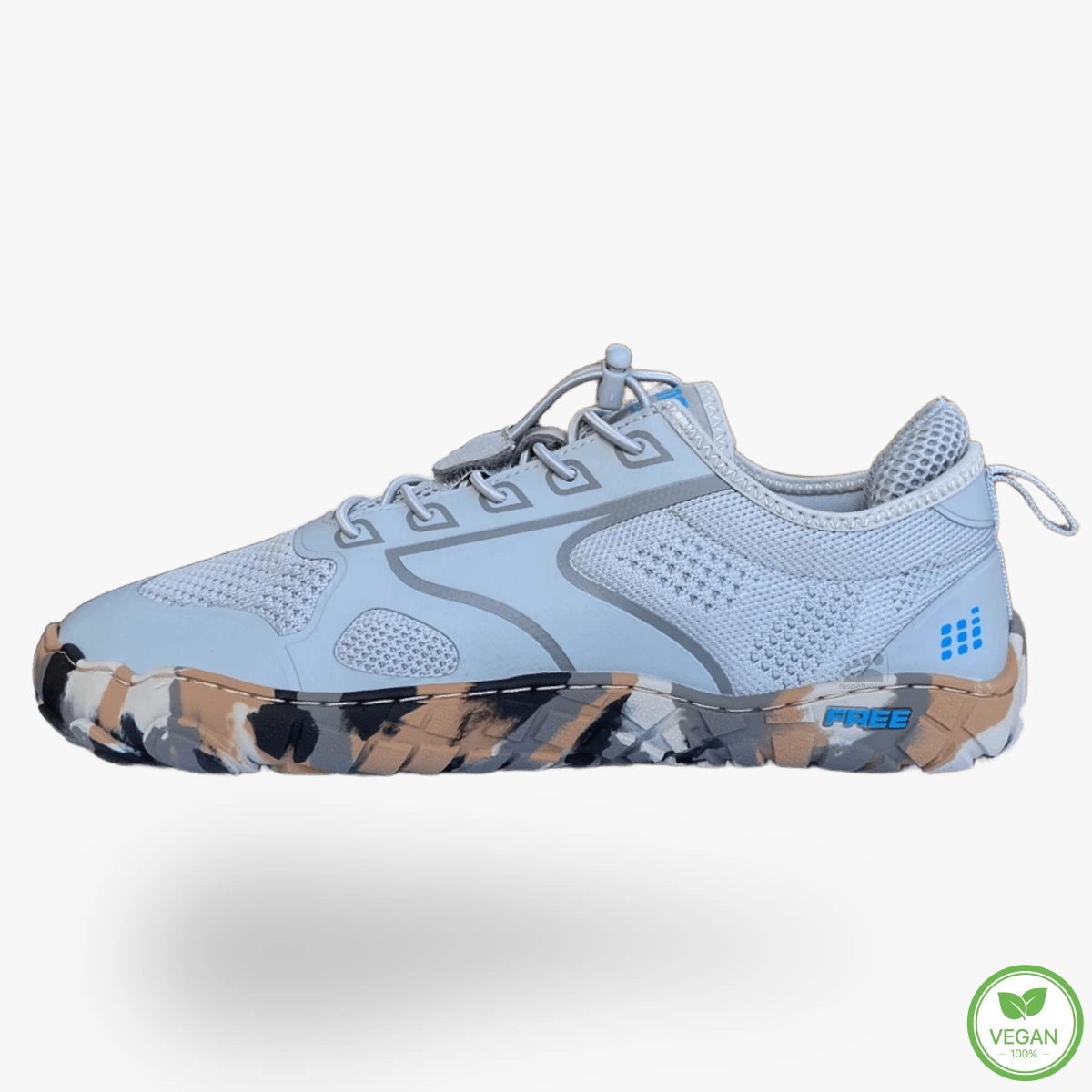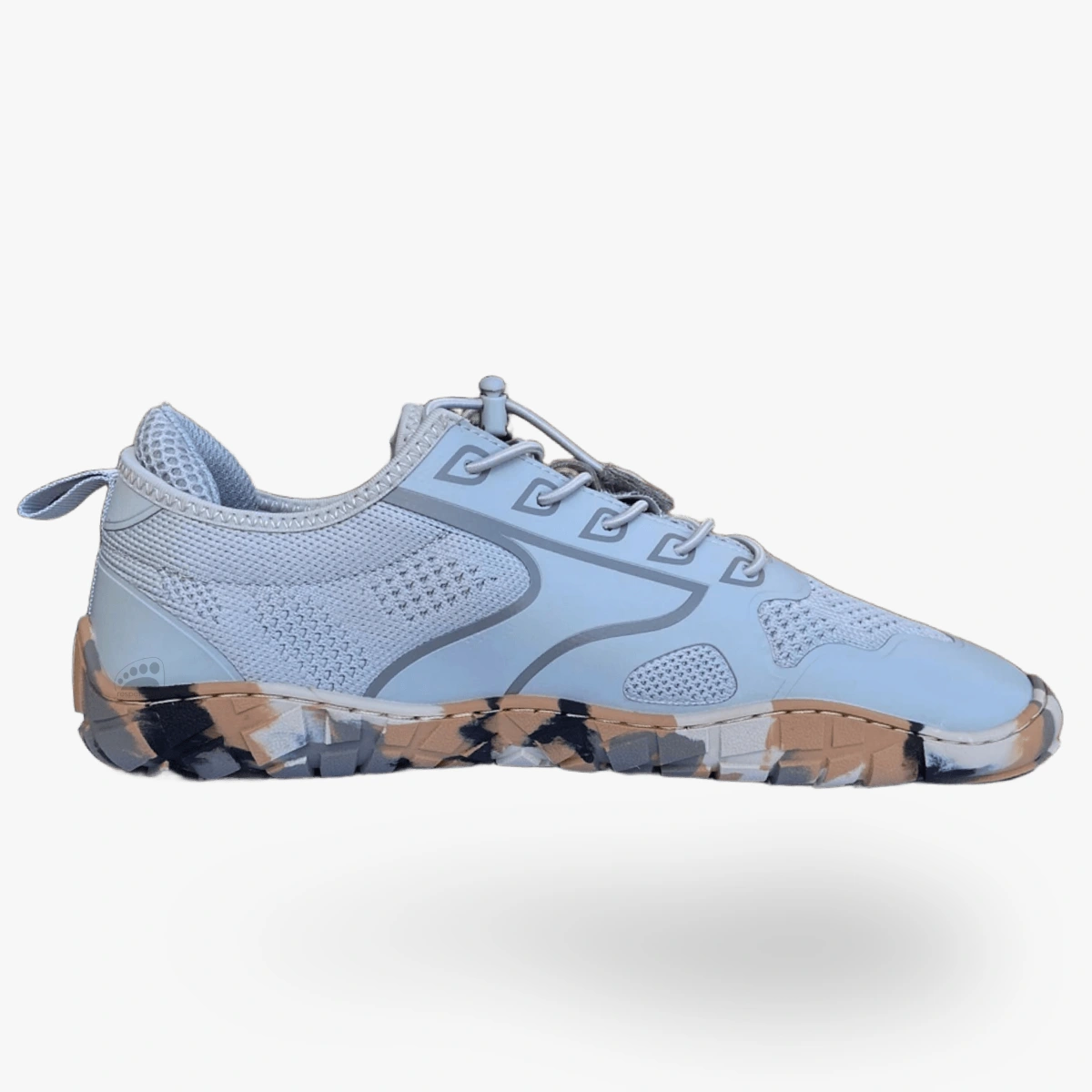 El sistema de cierre con cordón elástico permite un ajuste rápido y cómodo. Su diseño incorpora tejido de malla combinado con refuerzos laterales que aportan sujeción sin restar ligereza. La amplia puntera sigue externamente la silueta natural de los dedos, y la suela de goma, completamente plana (zero drop), incorpora un patrón de relieve que mejora la tracción y se adapta a los movimientos del pie.